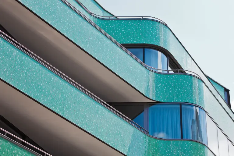 Sklenená mozaika vďačí za svoj oslnivý vzhľad súhre svetla a farieb, ktoré vytvárajú veľkolepé efekty na zakrivených tvaroch fasád. Poskytujú tiež jedinečný lesk, reflexný povrch a pôsobivý hĺbkový efekt.